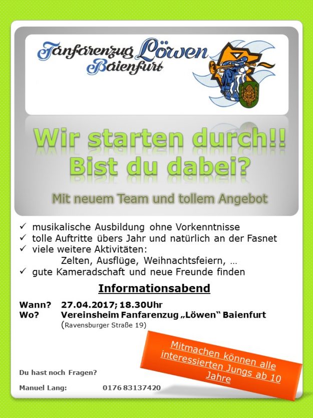 Wir starten durch!! Bist du dabei? – Jugendfanfarenzug Für alle Jungs ab 10 Jahren, die uns an der Fasnet gesehen haben oder durch Freunde Lust bekommen haben, im Jugendfanfarenzug „Löwen“ Baienfurt anzufangen, bieten wir einen Informationsabend an (siehe Flyer). Kommt einfach am besten mit euren Eltern vorbei. Auf euer Kommen freut sich das Jugendleiter-Team!!